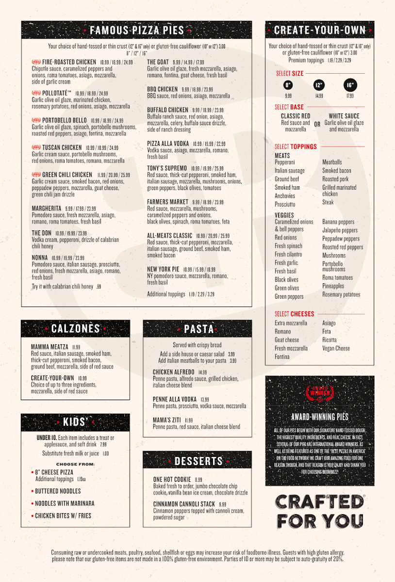 Guests can expect a range of thoughtfully crafted pizzas, from classic New York style cheese pies to creative specialty options like the Smokehouse Brisket or Tony’s Supremo. For those who prefer a personalized touch, the Build Your Own Pizza option allows for a custom creation featuring fresh toppings and choice of crusts, including gluten-free cauliflower.