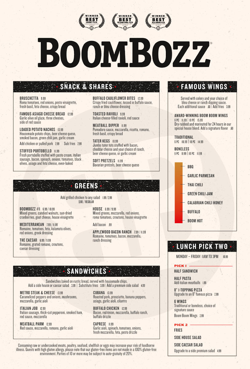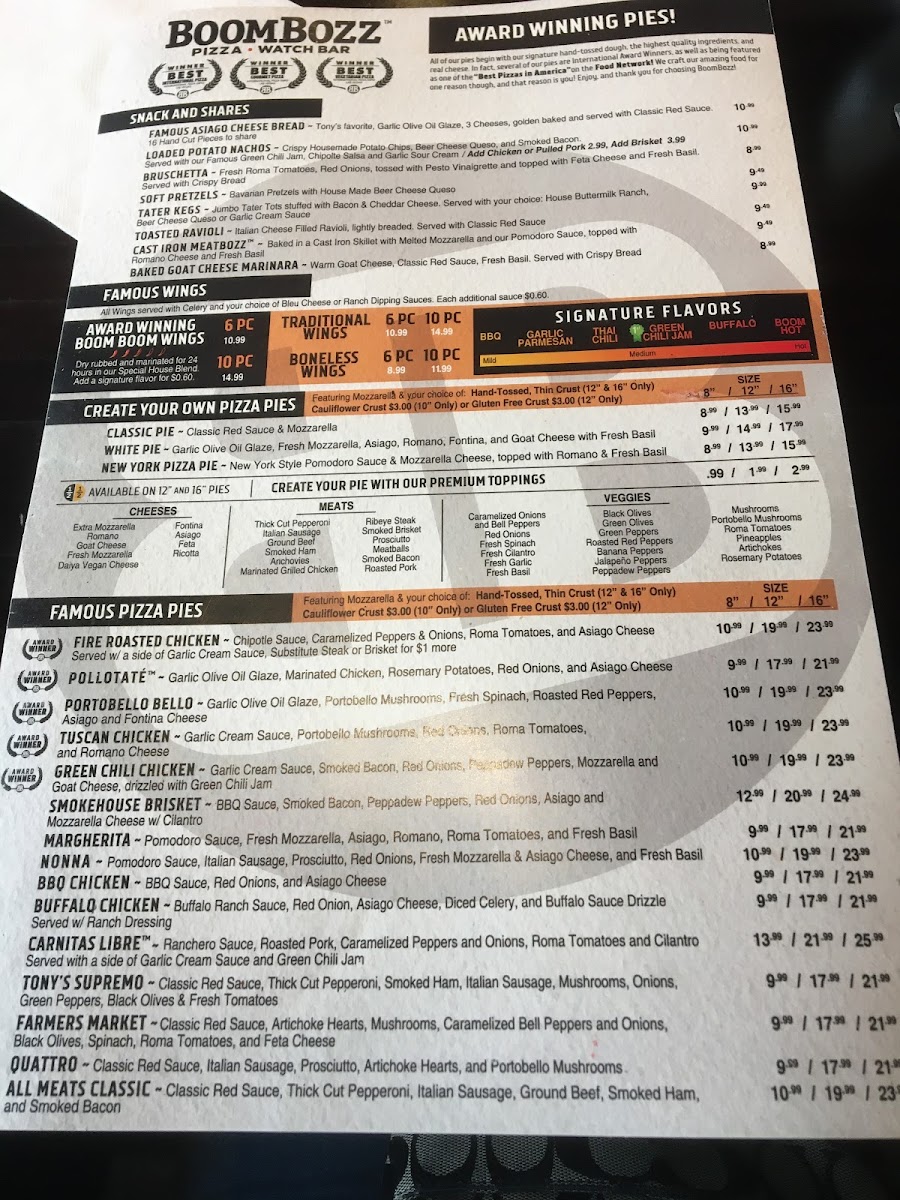 The menu at BoomBozz Pizza & Watch Bar reflects a relaxed, approachable style that suits both casual meals and social gatherings. It offers a variety of comforting bites and refreshing drinks, perfect for unwinding after work, catching a game, or enjoying a weekend night out.